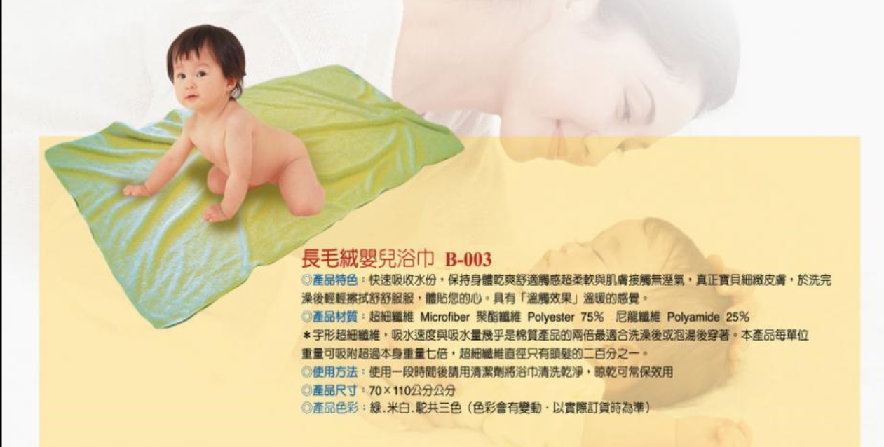 纖維細度只有0.2丹尼(約頭髮200分之一);具有輕柔,潔淨,與肌膚接觸柔軟又舒服,快速吸水。